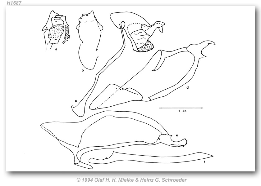 | Timochares ruptifasciata ♂ (LECTOTYPE of Timochares trifasciata f. obscurior Draudt, 1922) genitalia HONDURAS: San Pedro Sula (SMF L 4052, Mielke-522) [SMF] a) uncus and gnathos - ventral; b) tegumen and uncus - dorsal; c) lateral view without valvae and penis; d) right valva - interior lateral; e) left valva - interior lateral; f) penis - left view. Image published in: Mielke, Olaf Hermann Hendrik, and Heinz G. Schröder 1994. Die Typen und Typoide des Natur-Museums Senckenberg, 82: Insecta: Lepidoptera: Hesperiidae. Von M. Draudt aus der Neotropis beschriebene Arten. Senckenbergiana biologica 73(1/2): 135-158, 46 figs. (15 April); f. 10 |