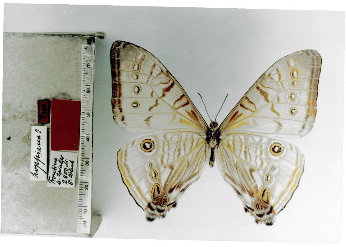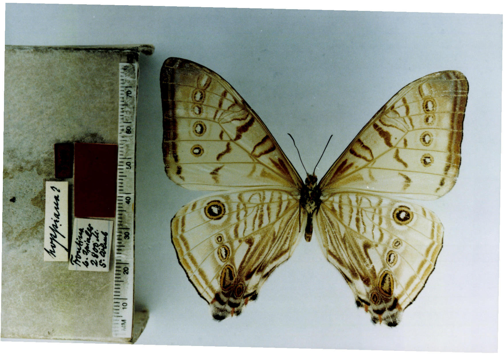 Morpho sulkowskyi hoppiana TYPE, TL: Colombia Photo taken by Gerardo Lamas and digitized by the Tropical Andean Butterfly Diversity Project, funded by the Darwin Initiative. Any use of this image, except for personal study, requires prior written consent of the housing institution. |
