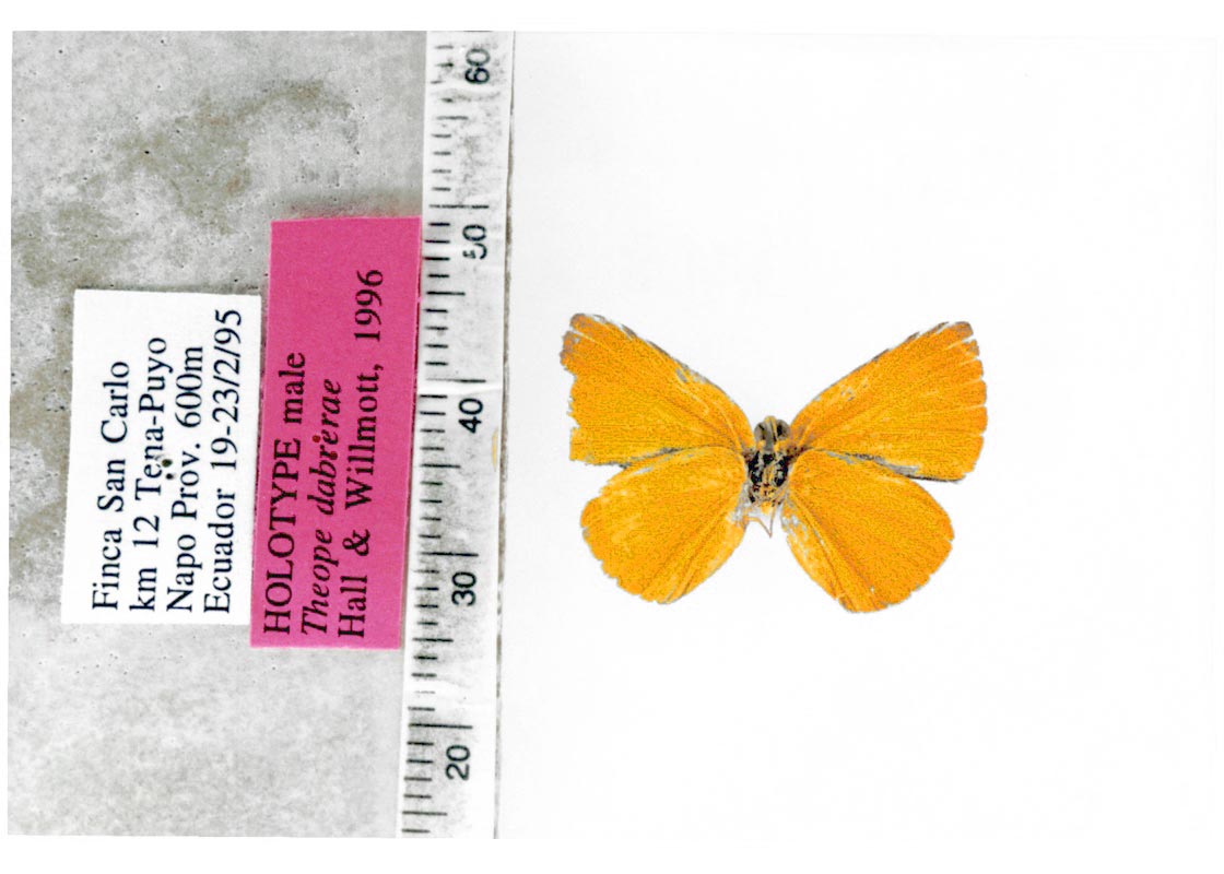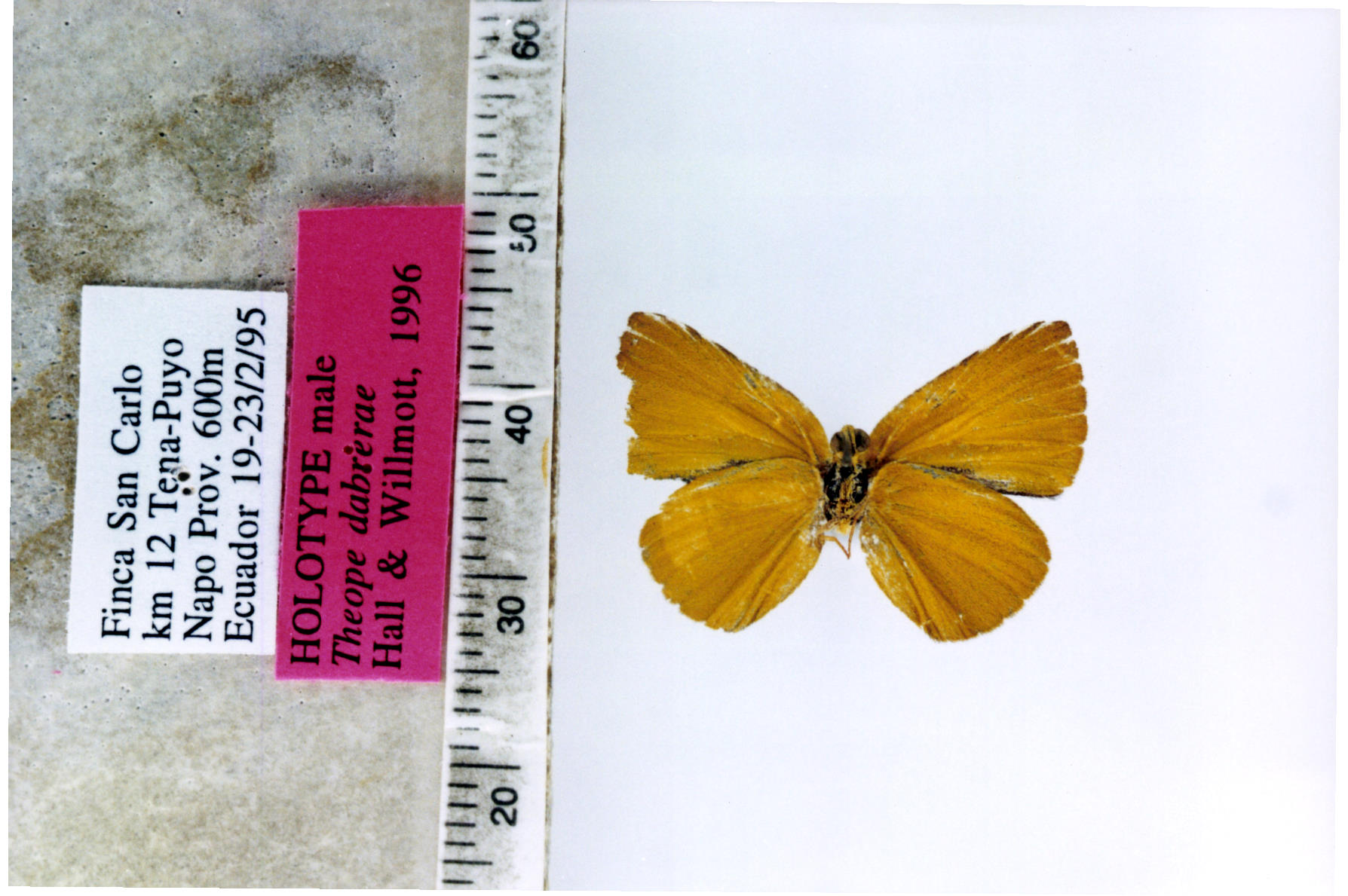 Theope dabrerae TYPE, TL: Ecuador Photo taken by Gerardo Lamas and digitized by the Tropical Andean Butterfly Diversity Project, funded by the Darwin Initiative. Any use of this image, except for personal study, requires prior written consent of the housing institution. |
